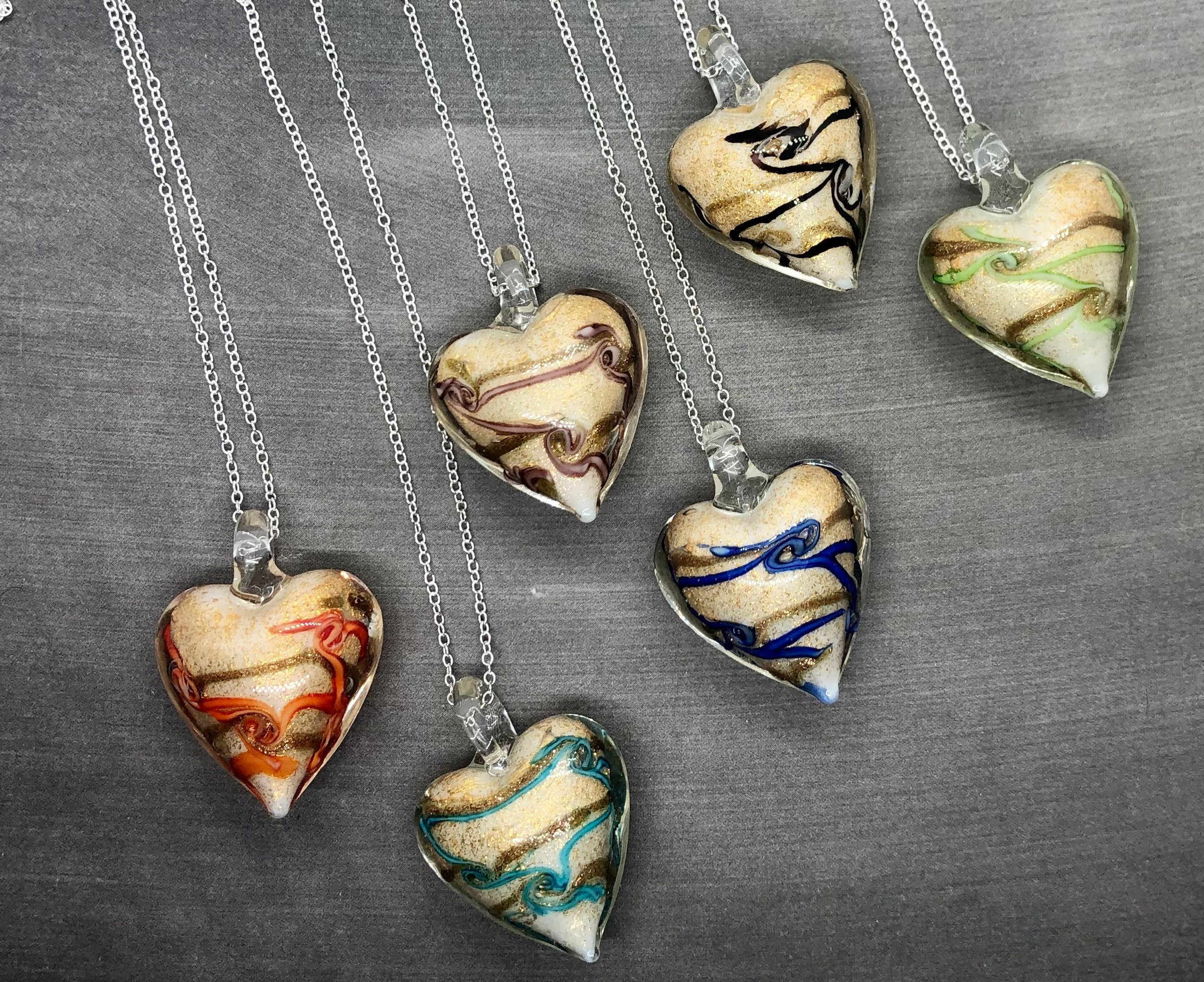 This necklace has a Hand-Blown Glass heart pendant which is approximately 1 1/2 inches by 1 inch in size. It is free floating on your choice of a delicate sterling silver- or silver-plated cable chain in your choice of length (15, 16, 18, 20, 22 or 24 inches).